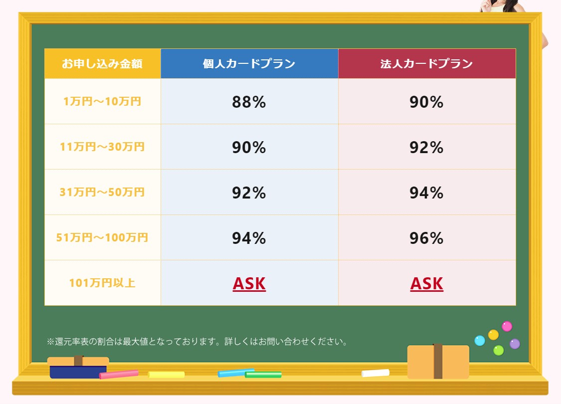 こちらは実際の利用者の口コミでは、あくまでこれは最高換金率で、このような換金率が適用されることは少ないようです。カードの種類などで換金率は変わるようで、手数料などの記載がないので、別途手数料などもかかると思われます。