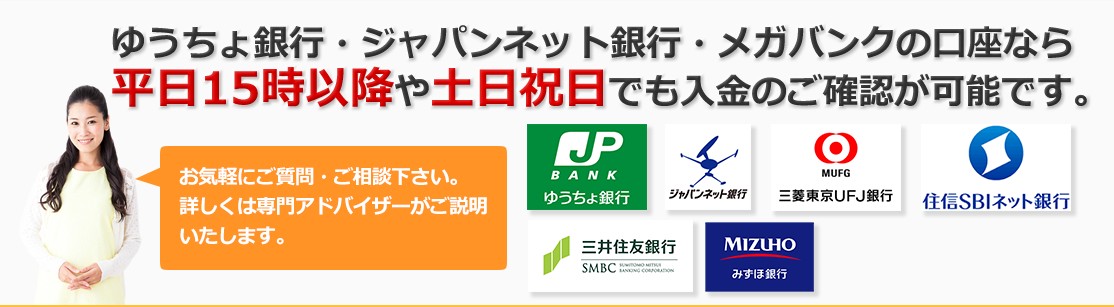 15時以降や土日祝日振込みを希望する方は以下の銀行口座をお持ちになれば対応できます。24時間いつでも振込みできます。