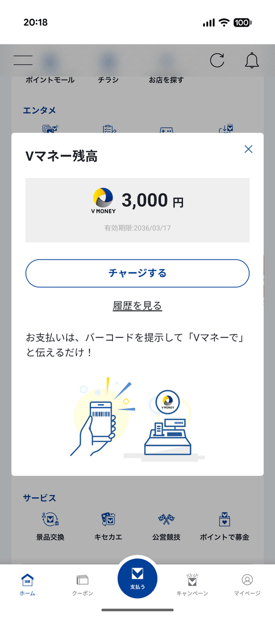 ペイディ側の瞬時の審査に通過すると、Vマネー残高に指定した金額が即座にチャージされます。